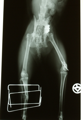 anz ehrlich - einer älteren Katze hätte ich das, was in den nächsten Wochen und Monaten auf die kleine Schwarze zukommen sollte, nicht zugemutet. Aber mit gerade mal einem Jahr und der Tatsache, daß keine inneren Organe verletzt waren, hatte sie eine Chance - und die kleine hat sie genutzt! Der glatte Bruch wurde mit Draht gespickt, der Trümmerbruch mit einem Fixateur extern versorgt und ins Becken kam eine Miniplatte. Alle OPs wurden gut überstanden und ihren neuen Namen "Kohle" bekam die kleine spontan, als die Rechnungen sich aufsummierten. Über zwei Monate mußte sie in einer Hundetransportbox leben, mit gerade mal Platz genug für ein Katzenklo, Näpfe und eine Kuscheldecke, dann stundenweise unter Kontrolle "Zimmerfreigang". Und jede Woche mehrmals zum Verbandswechsel... Es war keine leichte Zeit, aber die sehr gut durchgeführten OPs und die Sorgfalt der Nachbehandlung trugen Früchte. Kohle jammerte nicht groß vor sich hin, sondern freute sich an den kleinen Annehmlichkeiten. Statt beim Verbandswechsel knurrend ihren Unmut zu zeigen, streckte sie das Bein mit dem FixEx genüßlich der Tierärtin entgegen, die dann auch ganz folgsam vorsichtig zwischen den Stäben kraulte.