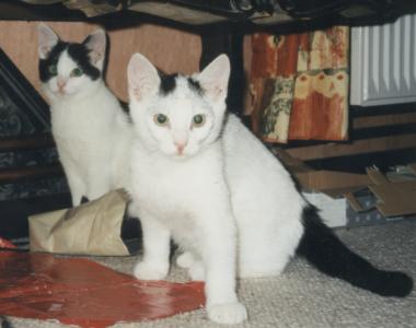haddeus und seine Schwester Boboline gehören in die Sparte "Never say never again". Nach Henrys Tod wollten wir eigentlich keine Katzen mehr zu uns nehmen, die Straße ist einfach zu mörderisch, trotz Geschwindigkeitsbegrenzung. Aber wie es so ist, Inkonsequenz ist auch eine menschliche Eigenschaft. Und als eine liebe Kollegin junge Katzen abzugeben hatte, zogen Thaddeus und Boboline, genannt Teddy und Line, bei uns ein. Als Herbstkatzen waren sie am Anfang ein wenig kränklich, wuchsen aber dann zu richtigen Prachtexemplare heran. |