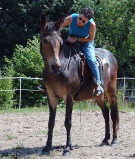 | E in ganz wichtiger Punkt ist natürlich auch noch die Tatsache, daß Pferde Herdentiere sind. Sie müssen sich also rechtzeitig nach einem Kumpel für Ihr Pferd umsehen. Wir stießen bei der Suche nach einem sogenannten "Beistellpferd" auf Sam, ein langohriges, ziemlich heruntergekommenes Maultier. Sein "Halter" kümmerte sich offensichtlich nicht sehr um sein Wohlergehen. Es war ein ziemlicher Nervenkrieg, bis Sam bei uns einziehen konnte, aber es hat sich eindeutig gelohnt. An dieser Stelle nochmals vielen Dank an Heike, Fritz und Udo für ihre Hilfe. Ohne euch und die fachkundige und nette Unterstützung der IG Esel- und Mulifreunde, besonders Fr.Bank-Lauer, wäre Sam wohl seit Jahren in der Wurst. |